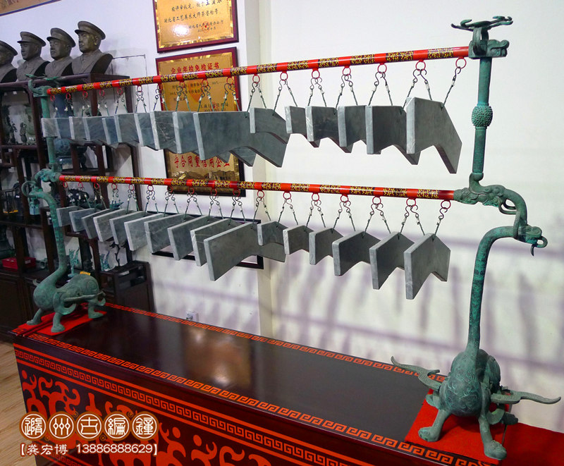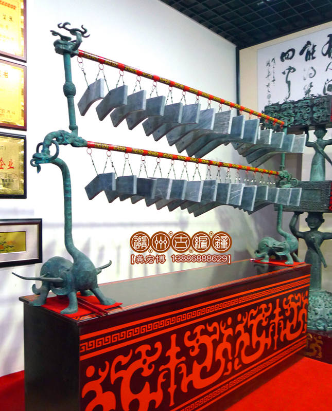 公司復(fù)原制作的32件曾侯乙編磬與原文物一致,編磬全長2.23米,寬50厘米,高1.08米;為了演奏方便,公司設(shè)計(jì)了編磬木桌承托編磬,長2.4米,高70厘米,寬45厘米,陳列編磬后總高度:1.78米。木桌內(nèi)做儲(chǔ)藏柜,可方便樂隊(duì)保管其他樂器及服裝,方便實(shí)用。