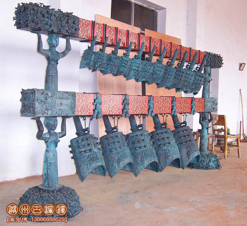 特制16件曾侯乙青銅編鐘,是隨州古編鐘公司應(yīng)美國(guó)客戶的要求,按曾侯乙編鐘設(shè)計(jì)制作的一套特制編鐘,編鐘為青銅鑄造,采用國(guó)際標(biāo)準(zhǔn)樂音音高A=440Hz調(diào)音,可以演奏古今中外樂曲,編鐘大梁采用優(yōu)質(zhì)松木制作,表面噴漆,彩繪花紋。編鐘制作完成后,由公司專人專車配送到美國(guó)客戶位于中國(guó)珠海的公司陳列。這位美國(guó)客戶非常喜歡中國(guó)文化,曾多次到公司進(jìn)行考察了解,最終在公司定購一套特制16件曾侯乙青銅編鐘。