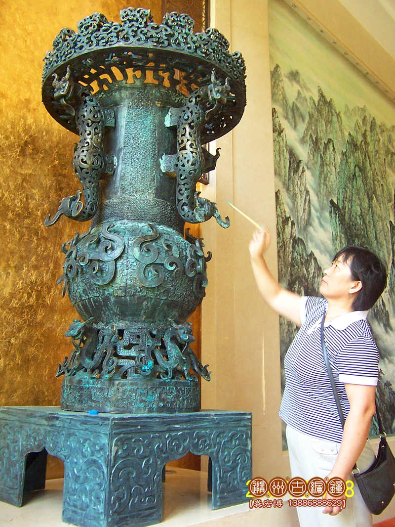 青銅尊造型端莊優(yōu)美,紋飾精巧、復(fù)雜,是現(xiàn)已出土的青銅器中最復(fù)雜、精美的珍品。尊高2.13米,敞口寬1米。尊是盛酒器,內(nèi)盛摻有香草汁的酒,祭祀時酌以敬獻(xiàn)神靈,賓禮時酌以飲客。青銅尊安裝 到湖北省接待重要貴賓的地方——武漢東湖賓館會議廳,同時訂購的還有青銅筒形器等,這些器物擺放 在中式裝修風(fēng)格的建筑中起到了畫龍點睛的作用,將它們擺放在會議廳,代表湖北燦爛的歷史文化。